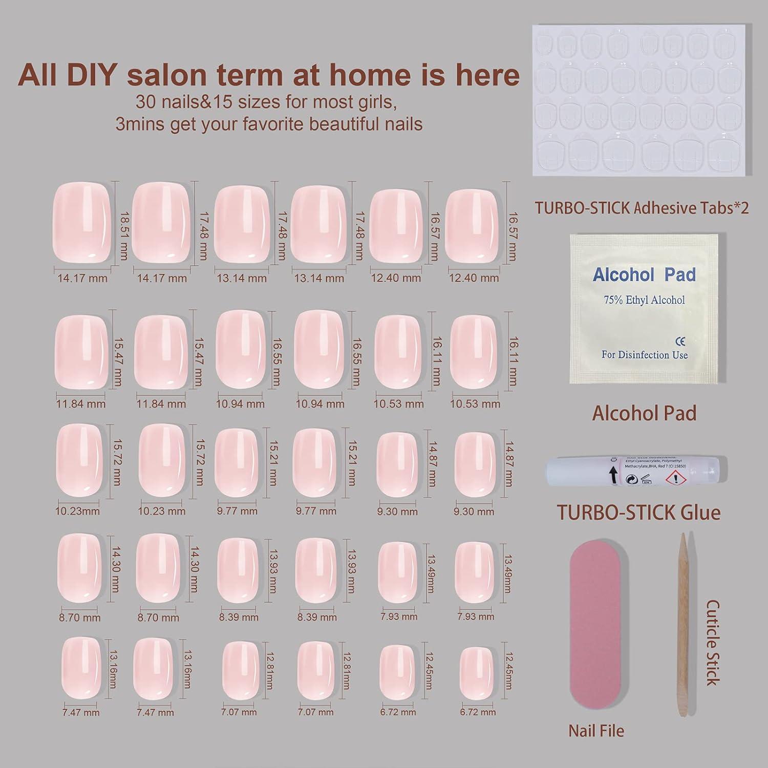Pacakge Contents: Press on nails stick kit contain 30PCS, 15 sizes of acrylic nails to meet the different nails, jelly glue, liquid glue, nail file, cuticle stick, prep pad, exquisite and compact false nails package by any travel plan